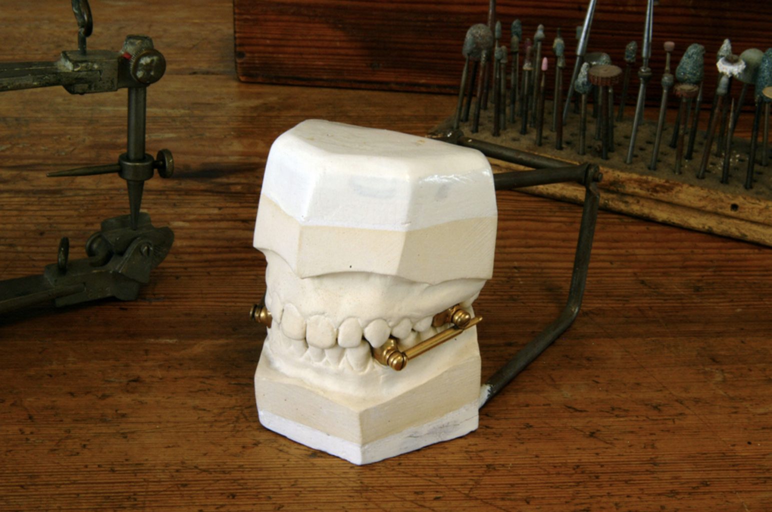 Het onder- en bovengedeelte hebben allebei 4 ringen die met lijm vastzitten om de kiezen. Aan de zijkanten zitten tussen de ringen boven en onder uitschuifbare pootjes die het onder- en bovengedeelte met elkaar verbinden. Deze zijn zo afgesteld dat bij dichtbijten de onderkaak in de juiste stand onder de bovenkaak komt te staan.