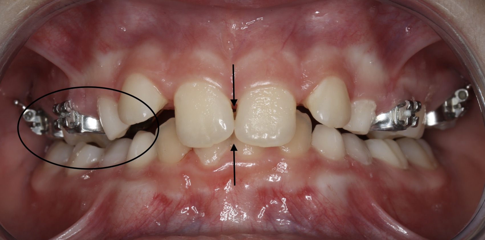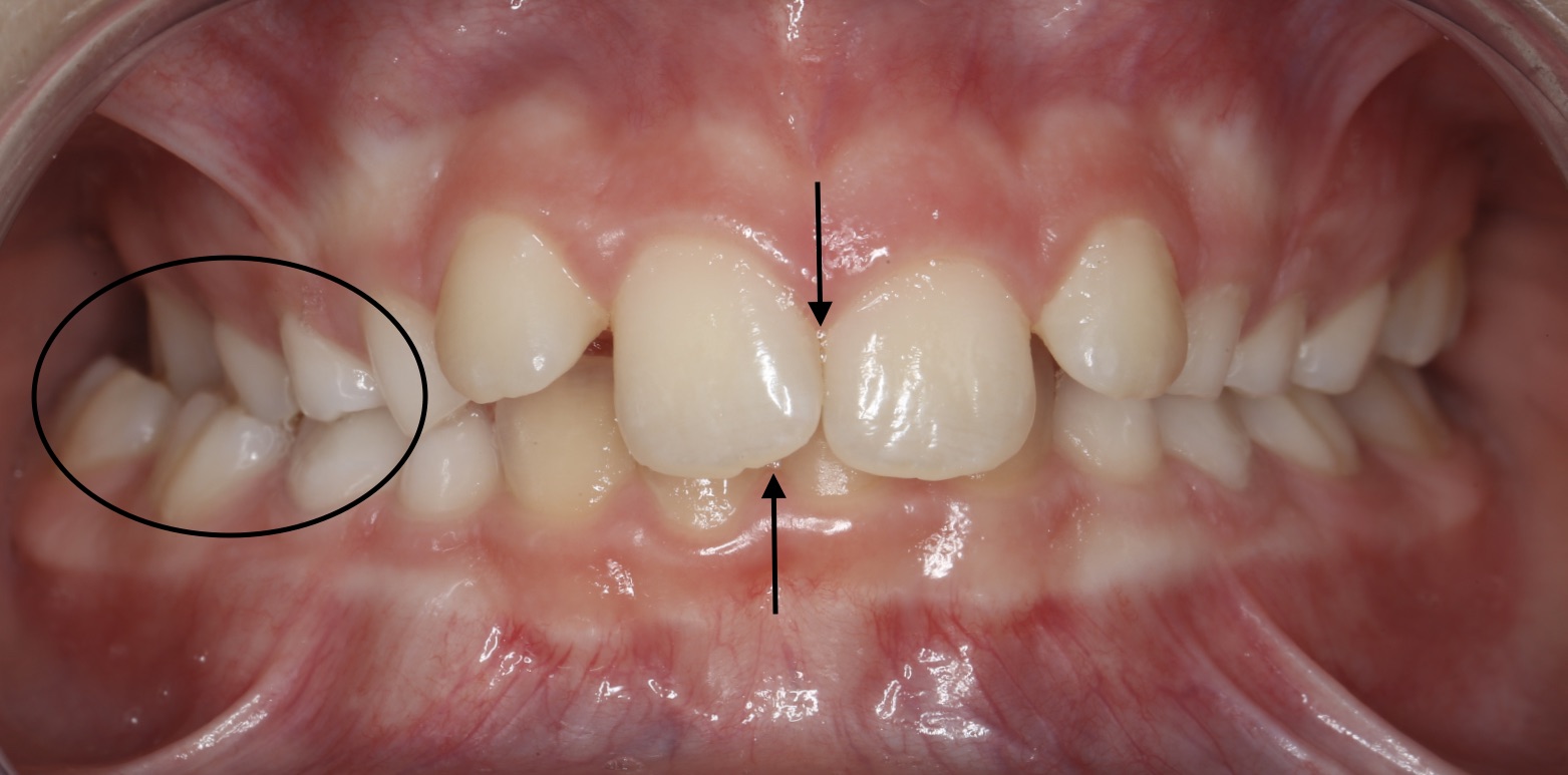 De middens van boven- en ondertandboog zijn niet gelijk, omdat ze naar rechts in kruisbeet dichtbijt nu de onderkaak niet recht in de bovenkaak past.